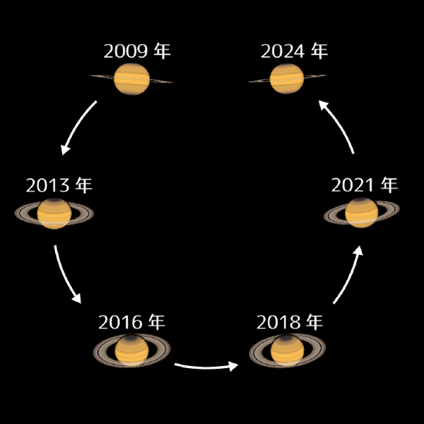 土星は約30年で太陽の周りをまわっています。このため15年に一度、見掛け上真横から見ることになり、環のない土星になります。輪のない土星から約7年。今年も環のある土星を見られます。