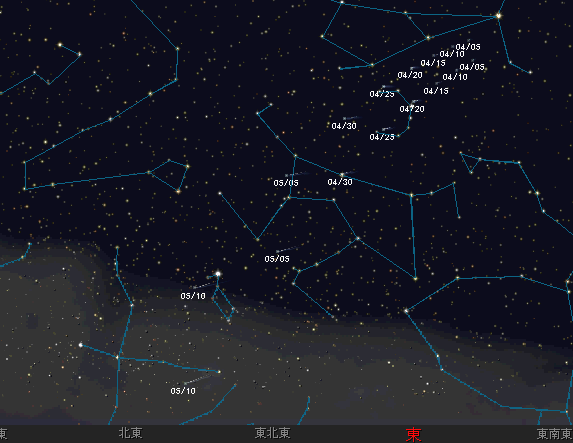 | 2006年4月5日〜5月10日の 彗星の位置 (名寄市) |