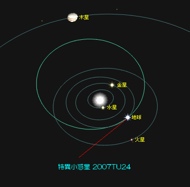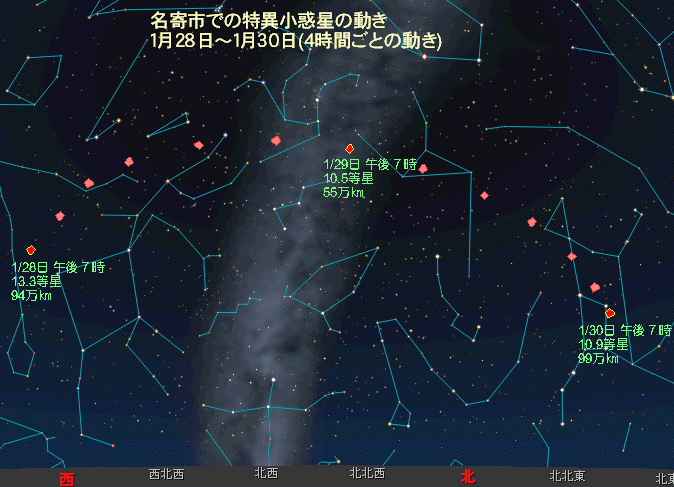 | この小惑星は2007年10月11日に発見され、2008年1月29日午後6時頃が 最も地球に接近し約55万キロとなり、その接近距離は地球から月のわずか1.4倍 のところを通過することになります、この小惑星の推定直径は約150m〜600mで 2.85年で太陽の周りを回っています。 接近日には約10等星程度で見られます。(計算値はGUIDEにて) |