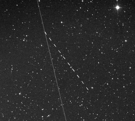 | 2008年01月29日 18時13分04秒〜23分17秒 約10分間の動き 25cm FL1500mm BJ42L CCD 露出各10秒 明るさ 約+10等星、地球からの距離 約55万キロ 気温-10℃ |