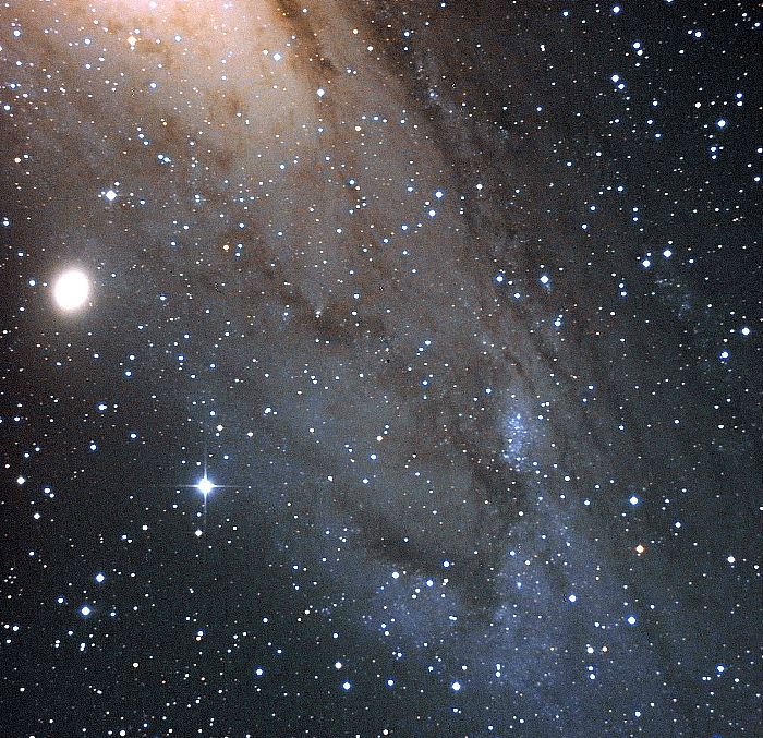| 秋の代表的な銀河で、見かけの大きさが満月より大 きく、月のない夜空では肉眼でもかすかに見られます。 この銀河は私たちの住む銀河系の隣にあるため、この ように大きく見られますが、その距離は光のスピードで 走っても、約230万年かかる距離にあります。 |