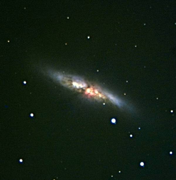 | おおくま座の銀河で、M81星雲のすぐそばに見られます この星雲は数億年前に、M81星雲との衝突により現在でも 激しい爆発が繰り返され、新しい星が次々と誕生しています。 |
