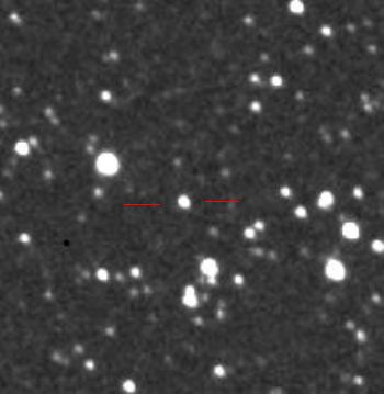 | ・撮影日 2005年5月11日 午前0時29分〜1時29分 (1時間) ・機 材 28cmの望遠鏡に冷却CCDカメラにて撮影 露出30秒 ・この日の地球からの距離 45億キロ ・明るさ 約+14等星 |