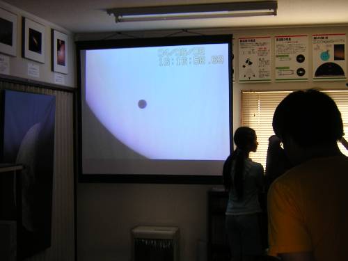 | 展示室内のプロジェクターに映し出された真っ黒な金星に歓声! |
