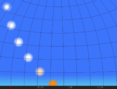 | 6月8日の金星の太陽面通過が起きている時の太陽の動き(名寄市でのようす) 午後2時〜午後7時 1時間間隔 (アストロアーツ・ステラナビゲーター Ver 6 にて作成) |