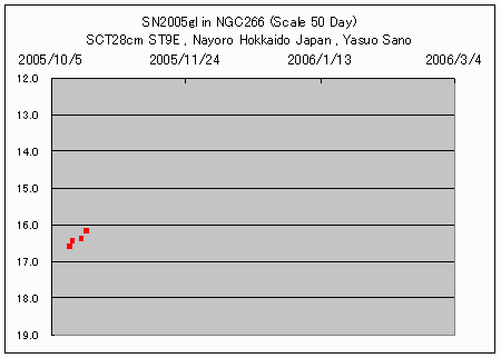 | object YYYYMMDD(UT) mag code SN2005gl 20051012.583 16.61CR San.VSOLJ SN2005gl 20051013.558 16.45CR San.VSOLJ SN2005gl 20051016.557 16.39CR San.VSOLJ SN2005gl 20051018.435 16.17CR San.VSOLJ Observer's code: San: Yasuo Sano (Nayoro, Hokkaido,Japan) Instruments: 28cm-SCT + ST-9E 45s exp. Comparison stars: USNO A2_1200_00354028 stars Rmag 14.9 | ||||||||||