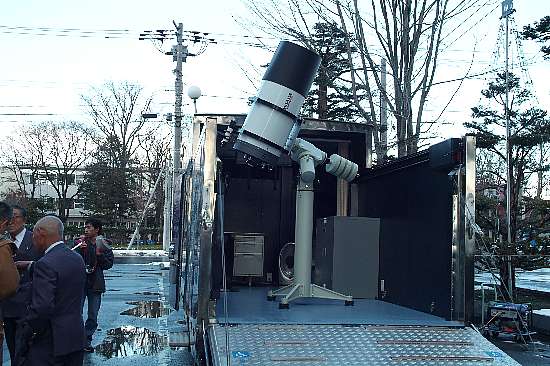 | 2005年11月24日名寄市役所にて、2005年キャビネット記念事業の一環として 移動式天体望遠鏡「ポラリスU」(約700万円相当)を市教育委員会に寄贈されました。 「ポラリスU」は、屋根を電動で開放することができるように改造した2トン車内に設置 コンピュータで操作し、ボタン一つで自由自在に動かすことができ正確な観測が可能 となりました、またマイナス30度まで使用することができるように整備されています。 |