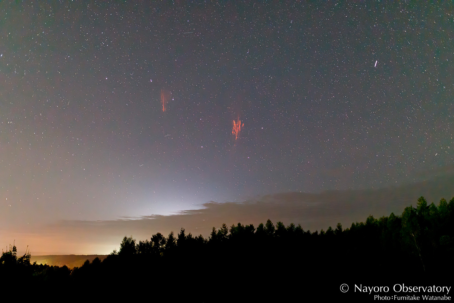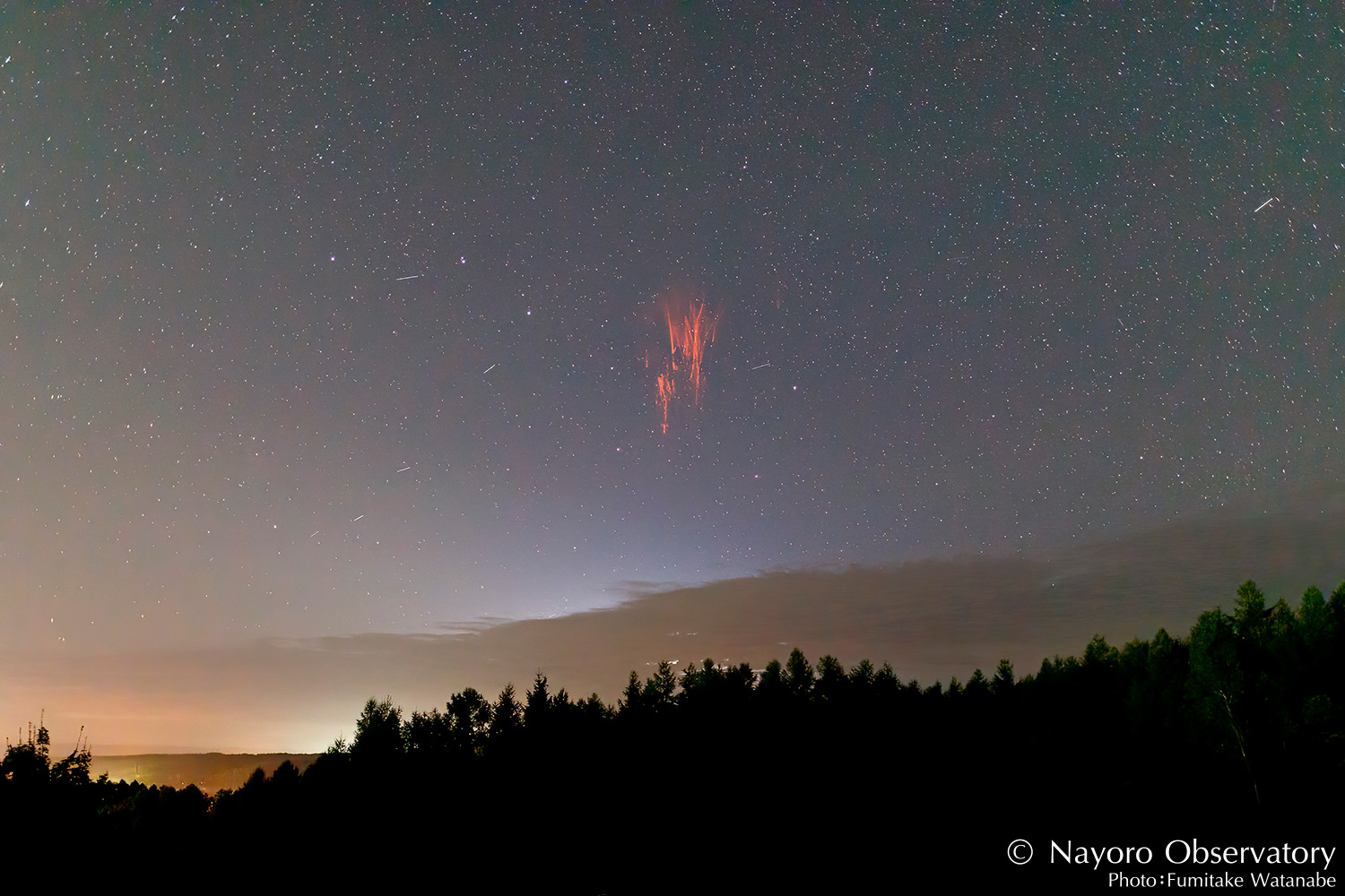 ※スプライトとはレッドスプライトとも言われ、高度約50~80kmで発生する超高層雷放電の一種で、通常の雷とは違い上方向に向かって放電されます。その色や妖精のように突然現れることからレッドスプライトと呼ばれています。