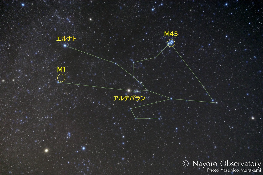肩の部分には「枕草子」で「星はすばる」と詠われた散開星団「M45 すばる(プレアデス星団、むりかぶし(八重山地方))」があり、肉眼でもその集まりが分かる。また、角の先には超新星残骸「M1 かに星雲」がある。この「M1」は超新星である「SN1054」の跡と言われている。