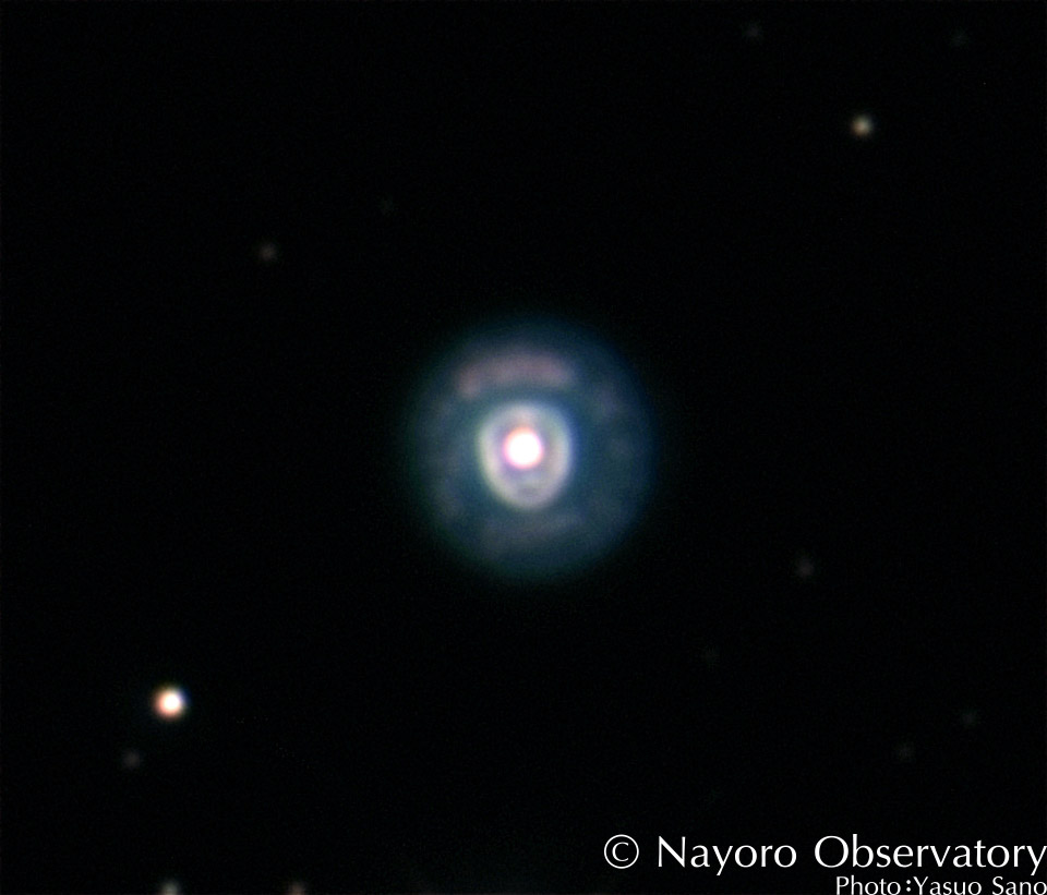 ふたご座にあり、50cmの望遠鏡で見ると中心部が小さな広がりで外側に淡い円形の二重構造に見られます。色は見る方により違いはありますが、やや薄い青色に見られます。地球からの距離は約1,300光年です。
