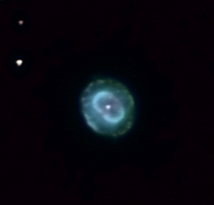 アンドロメダ座にあり、50cmの望遠鏡で見ると淡い楕円形で水色の雲のように見られます。地球からの距離は約2,200光年です。